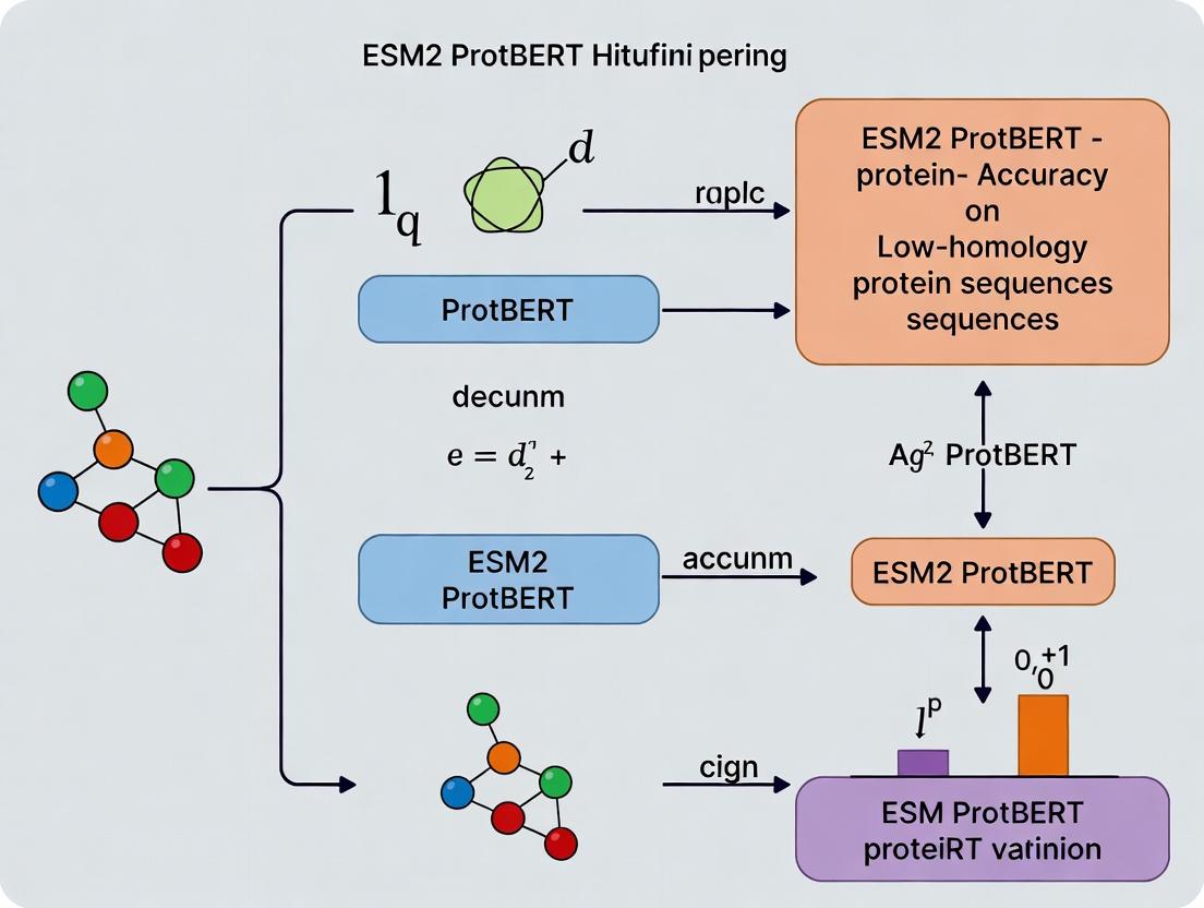 This guide is framed within a broader thesis investigating the accuracy of protein language models (pLMs), specifically ESM2 and ProtBERT, on low-homology protein sequences. This research is critical for real-world applications in drug development, where target proteins often lack close evolutionary relatives. We objectively compare the performance of these leading models against key alternatives.