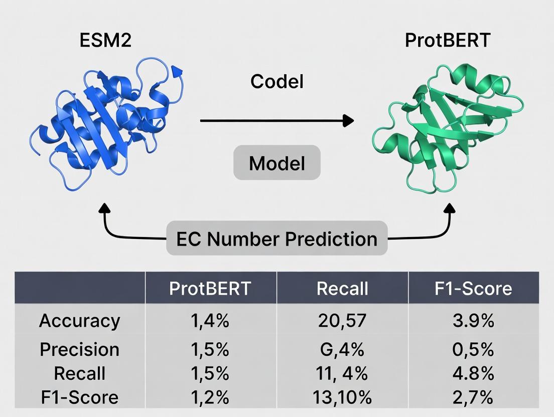 Accurate computational prediction of EC numbers from protein sequences accelerates functional annotation. This guide compares the performance of two state-of-the-art protein language models: ESM-2 (Evolutionary Scale Modeling) and ProtBERT.